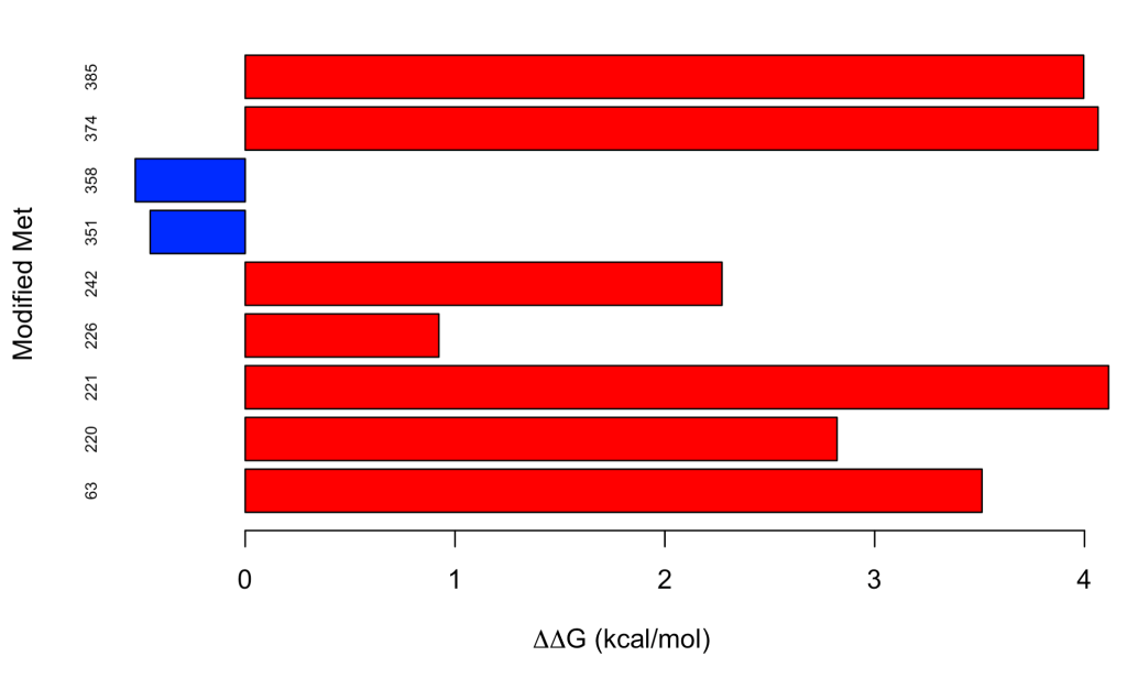 We can observe that the modification of most of the residues from alpha-1-antitrypsin has a destabilizing effect, with the exception of M351 and M358, whose modification has a neutral to slightly stabilizing effect.