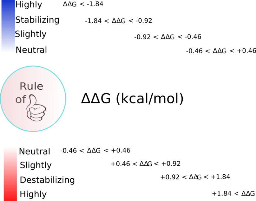 Where ΔG is the change in free energy corresponding to the folding of the protein from its unfolded state, either in the wild type (wt) or mutated (mut) version of the protein. Thus, a ΔΔG > 0 implies a decrease in stability (destabilizing mutation) while a ΔΔG < 0 is interpreted as an increase in stability (stabilizing mutation).