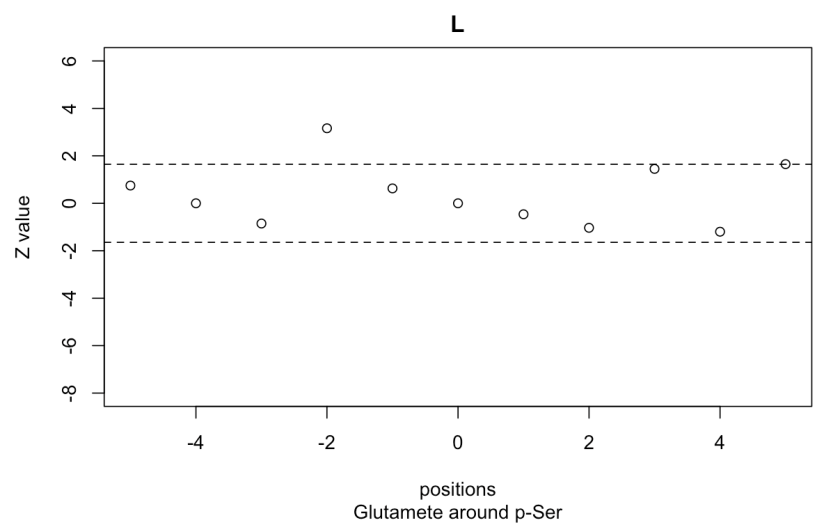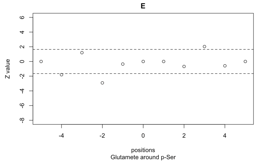 Finally, the function env.Zplot() allows us to visualize the results of these analyses graphycally. For that we choose the amino acid we want to focus on. In this way, we can visualize that at the position -2 (towards the N-terminal) glutamate es significantly avoided from the environment of p-Ser: