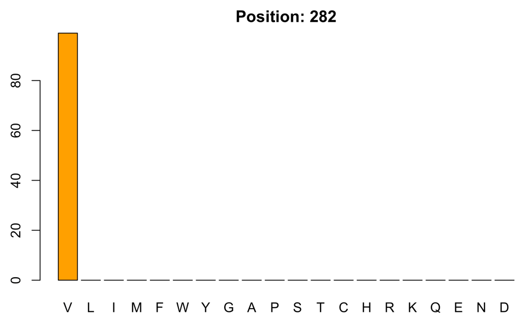 - V: Percentage at which the amino acid valine (Val) is found at that position.