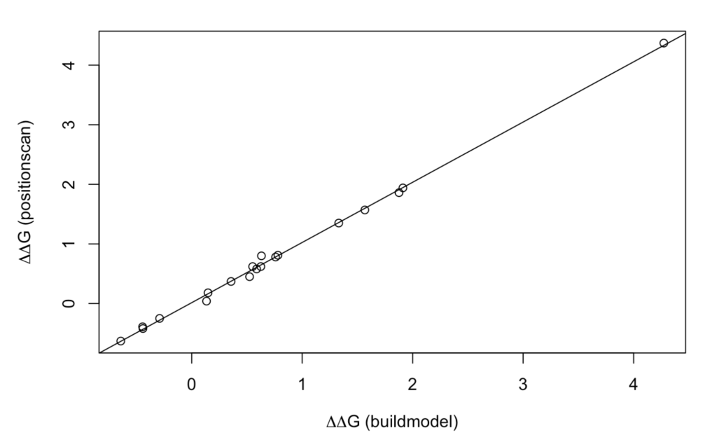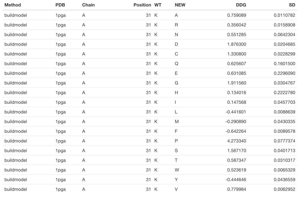 For the details regarding the differences between both methods you would like to consult FoldX’s manual. Nevertheless, at this point you may have already noted that the ‘buildmodel’ method returns a dataframe with 19 raws (one per proteinogenic amino acid alternative to the wild type), while the ‘positionscan’ method returns a dataframe with 24 raws. That is because in addition to the 19 alternative proteinogenic amino acids, this method assess the effect of changing the wild type residue to phosphotyrosine (y), phosphothreonine (p), phosphoserine (s) and hydroxiproline (h).