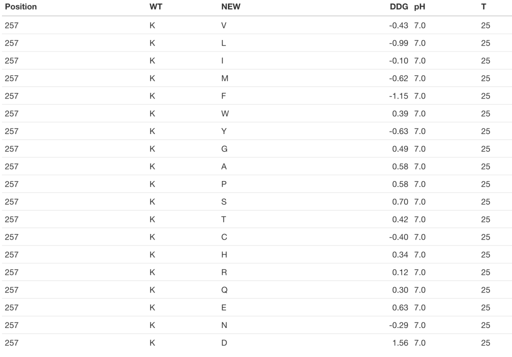 ΔΔG: Change in Gibbs free energy (kcal/mol), defined as DDG = DGmt – DGwt, where DG is the change in Gibbs free energy for the folding of the protein from its unfolded state. Thus, a positive value means a stabilizing effect, and vice versa.