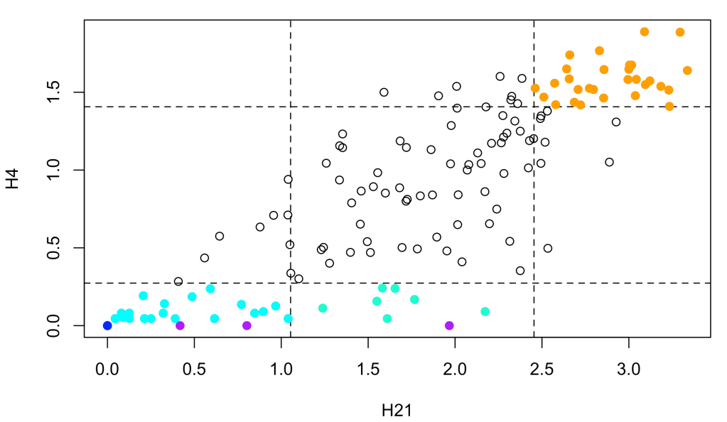 - conservative: H21 > percentile & H4 < percentile (aquamarine)