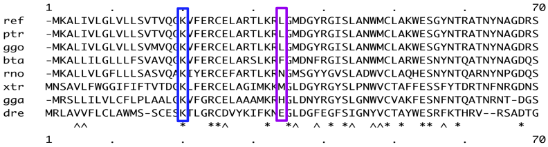 At this point, it is time to see shannon() in action. To this end we will use the human lysozime (UniProt ID: P61626). Since to compute the Shannon entropy, we have to carry out an alignment, you can select the species of interest to be included in the alignment, but if all you are interested in is to get an impression of the uncertainty at each position (that is, you don’t mind what species are included), you can select any of the pre-established list of especies (one among: ‘vertebrates’, ‘plants’, ‘one-hundred’, ‘two-hundred’).
