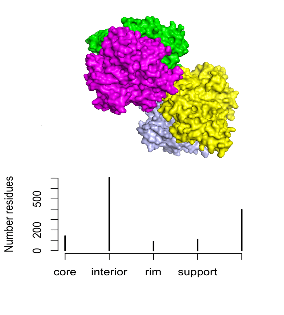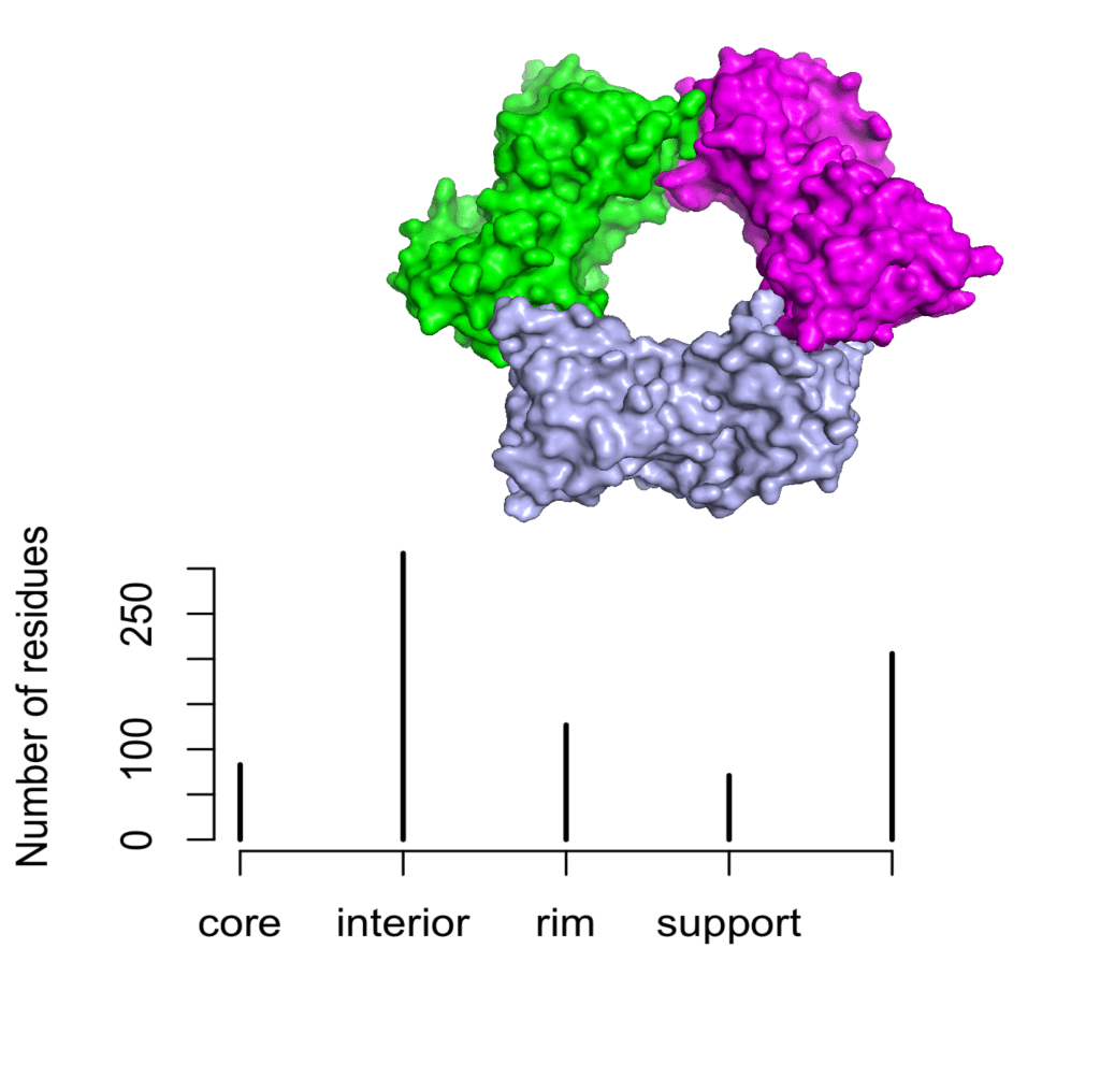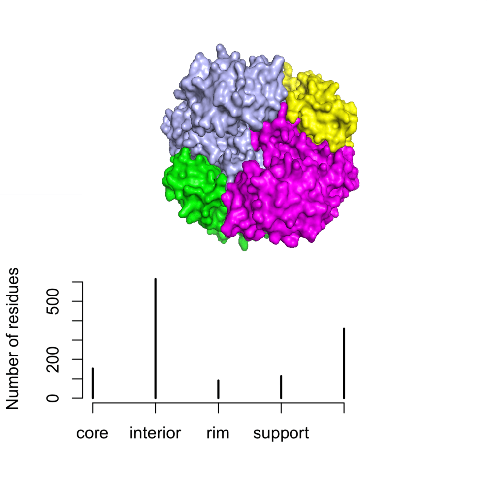 It is always crucial to consider the structure of proteins when analyzing their biological properties. For oligomeric proteins, we can define four structural regions based on the solvent-accessible surface area (SASA) and relative accessibility (ACC) of its residues. For this purpose, the function str.partition() carries out the computation of the SASA for each amino acid in the comples (ACCc) and in the monomer (ACCm). Those residues for which DACC = (ACCm – ACCc) > 0 are designed as interface residues and can be further sorted into support, rim and core according to the following criteria: