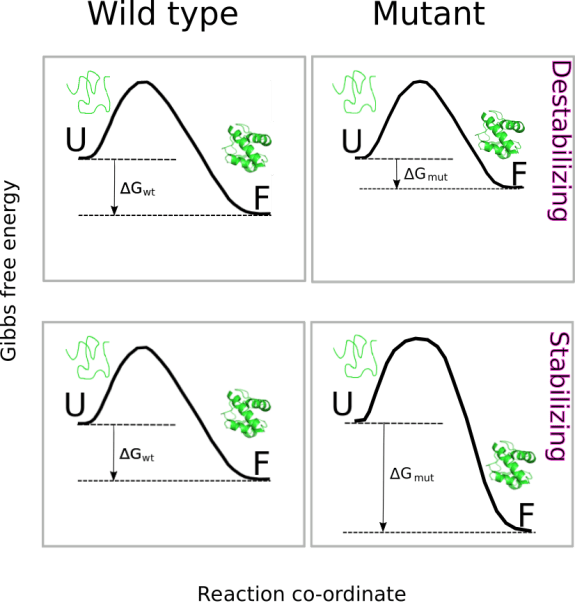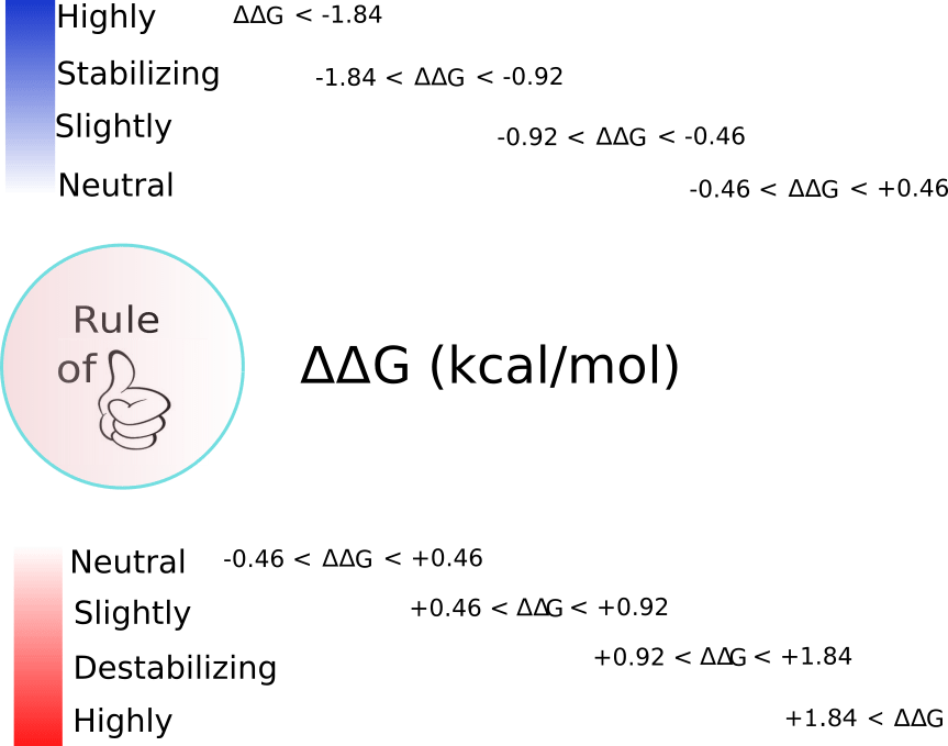 the thermodynamic stability effect of substituting a single amino acid residue in the protein of interest. To do that, both function perform an estimation of the change in Gibbs free energy, (kcal/mol), for the folding process. That is,