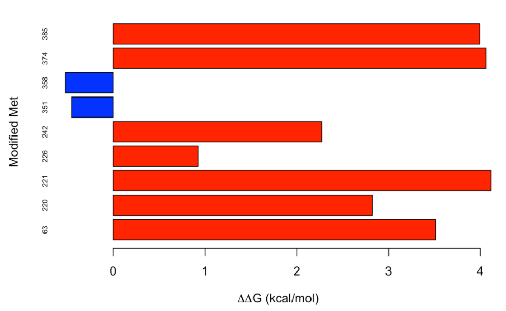 It is interesting to note that, while most of the methionine residues from alpha-1-antitrypsin destabilize the protein when oxidized, the effect is the opposite for the two methionine resides (M351 and M358) whose oxidation has been described to cause loss of anti-neutrophil elastase activity. We can observe that the modification of M351 and M358 has a neutral to slightly stabilizing effect.