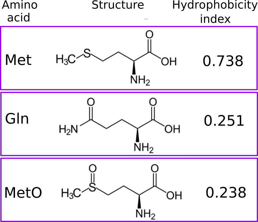 Currently, the target residues for the modifications implemented into ddG.ptm() are Ser, Thr and Tyr, which are phosphoacceptors and therefore, they are modified to pSer, pThr and pTyr. Another modification addressed by ddG.ptm() is the oxidation of Met to methionine sulfoxide (MetO). However, in the latter case the PDB model containing the modified residue will introduce, in the place of the target Met, either Gln or Thr instead of MetO (since MetO is not an option offered by FoldX). Oxidation of methionine adds polarity to an otherwise apolar side chain. More concretely, the side chain hydrophobicity index decreases from 0.738 (Met) to 0.238 (MetO) after the sulfoxidation reaction. Not surprisingly, polar amino acids such as Gln (hydrophobicity index of 0.251) and Thr (0.450) can sometimes mimic the sulfoxidized state of a protein. Furthermore, we also have evidence that nature may also employ this “trick”, but in reverse: evolving methionine sites from glutamine and threonine residues.